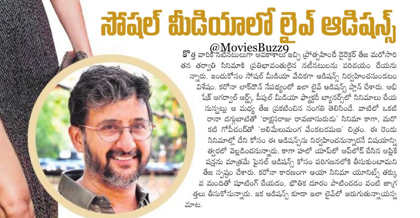 Director Teja To Do Online Auditions For Next Film Gulte Teja (born dharma teja jasti, 22 february 1966) is an indian cinematographer turned director, known for his work primarily in telugu cinema.